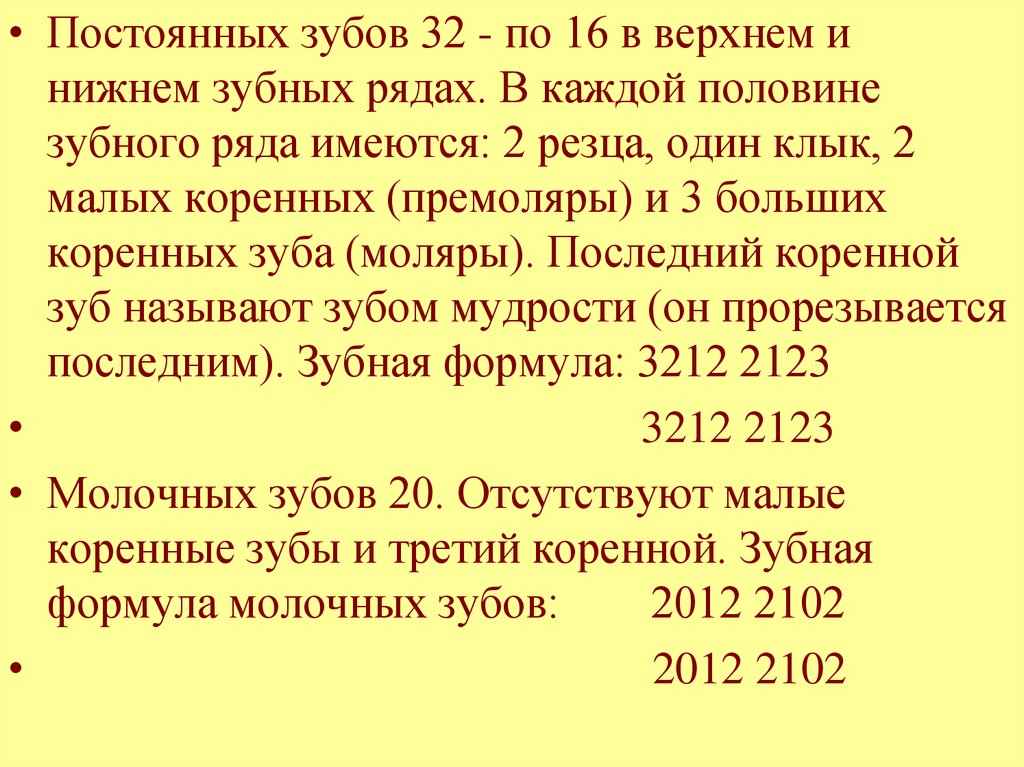 • Постоянных зубов 32 - по 16 в верхнем инижнем зубных рядах. В каждой половине