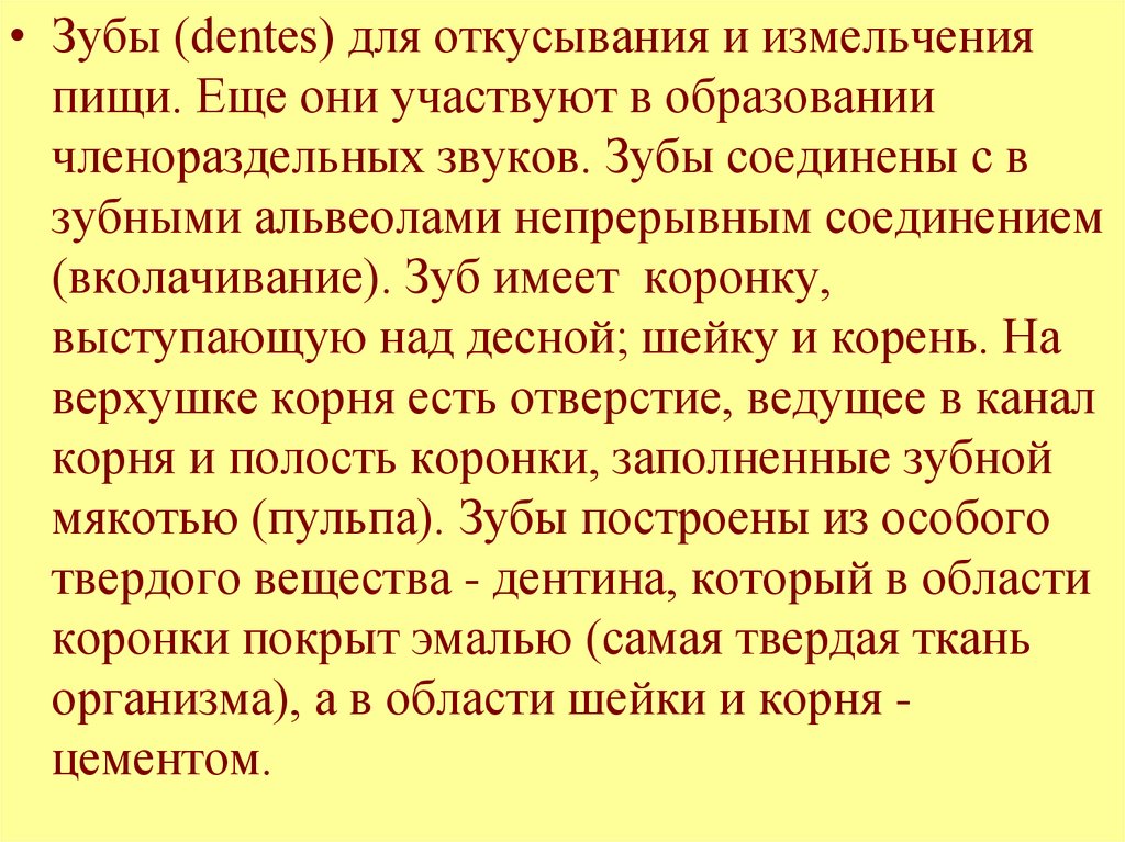• Зубы (dentes) для откусывания и измельченияпищи. Еще они участвуют в образовании