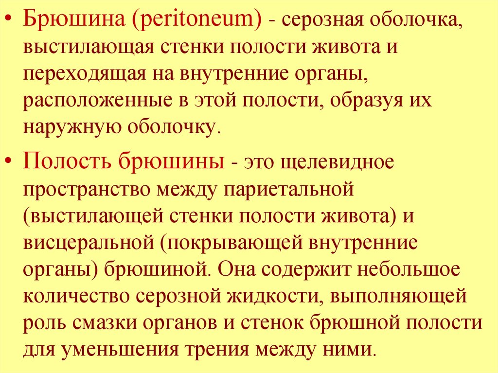 • Брюшина (peritoneum) - серозная оболочка,выстилающая стенки полости живота и