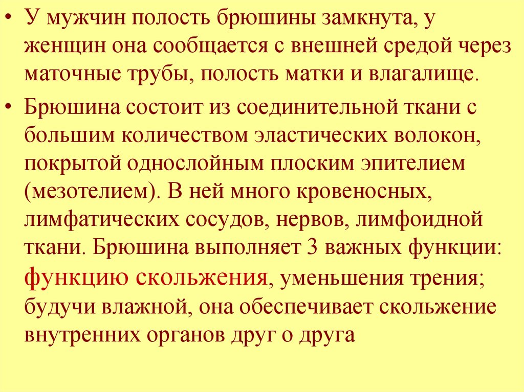 • У мужчин полость брюшины замкнута, уженщин она сообщается с внешней средой через