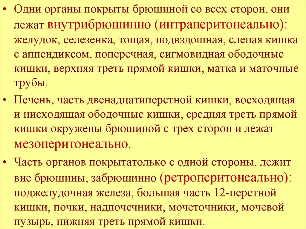 • Одни органы покрыты брюшиной со всех сторон, онилежат внутрибрюшинно (интраперитонеально):