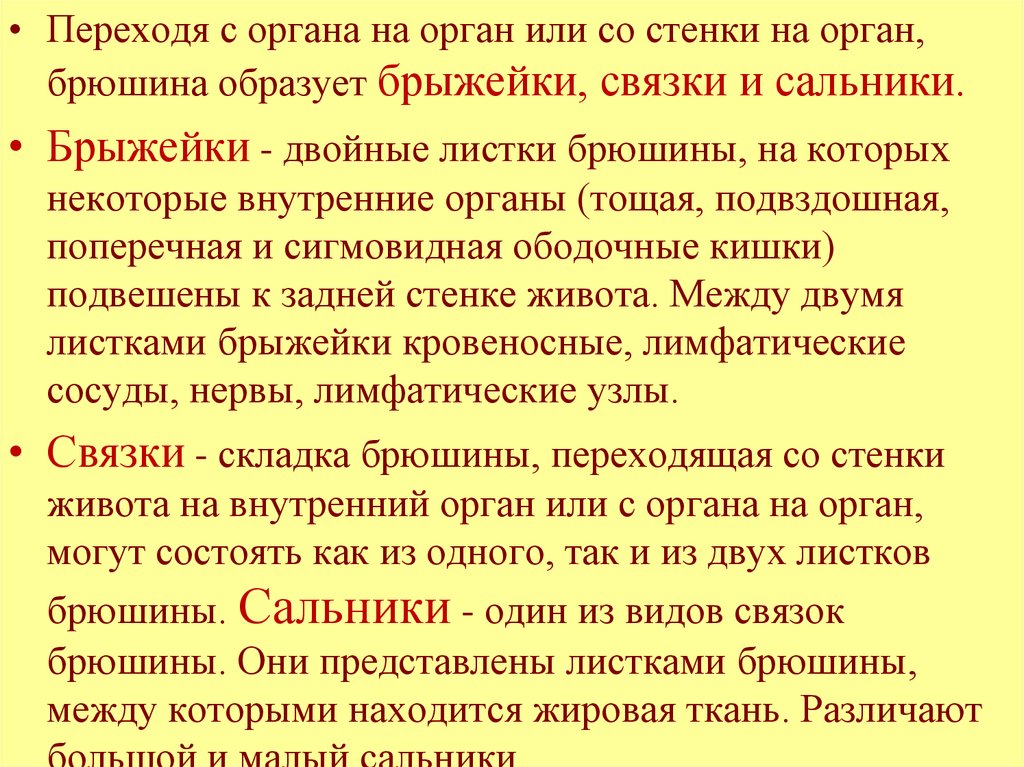 • Переходя с органа на орган или со стенки на орган,брюшина образует брыжейки, связки и сальники.
