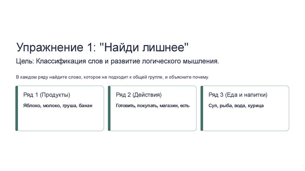 Упражнение 1: "Найди лишнее"Цель: Классификация слов и развитие логического мышления.