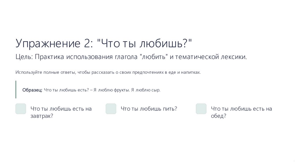 Упражнение 2: "Что ты любишь?"Цель: Практика использования глагола "любить" и тематической лексики.
