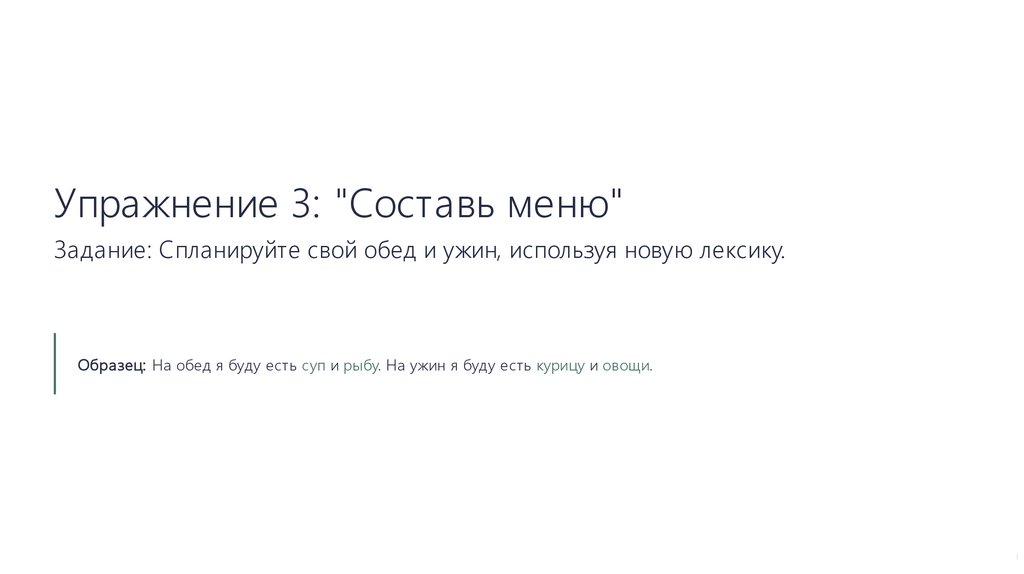 Упражнение 3: "Составь меню"Задание: Спланируйте свой обед и ужин, используя новую лексику.