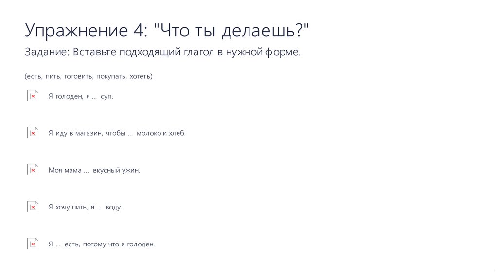 Упражнение 4: "Что ты делаешь?"Задание: Вставьте подходящий глагол в нужной форме.