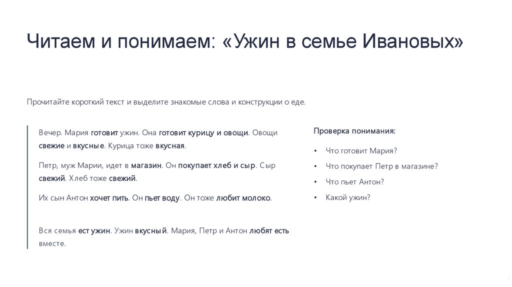 Читаем и понимаем: «Ужин в семье Ивановых»Прочитайте короткий текст и выделите знакомые слова и конструкции о еде.