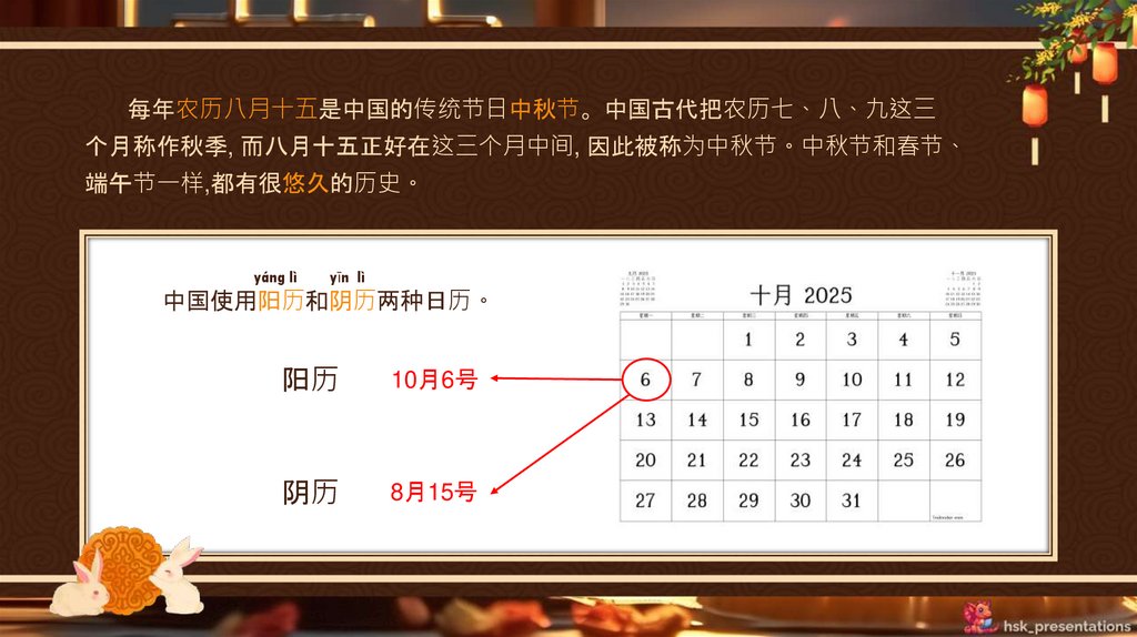 每年农历八月十五是中国的传统节日中秋节。中国古代把农历七、八、九这三个月称作秋季, 而八月十五正好在这三个月中间, 因此被称为中秋节。中秋节和春节、