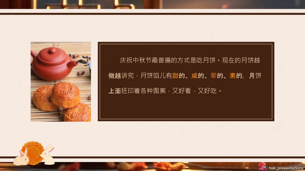 庆祝中秋节最普遍的方式是吃月饼。现在的月饼越做越讲究 月饼馅儿有甜的、咸的、荤的、素的 月饼