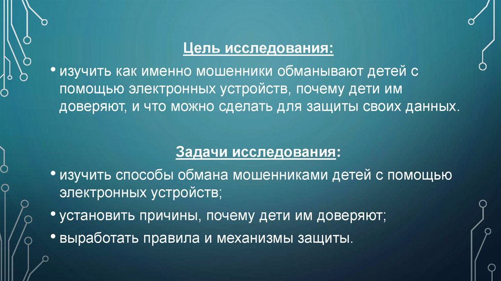 Цель исследования:• изучить как именно мошенники обманывают детей с