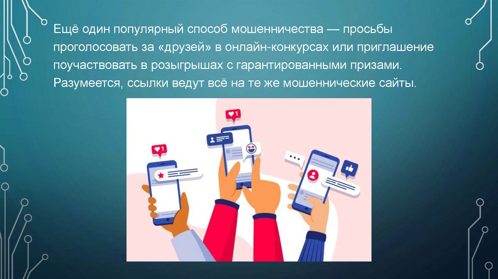 Ещё один популярный способ мошенничества — просьбыпроголосовать за «друзей» в онлайн-конкурсах или приглашение