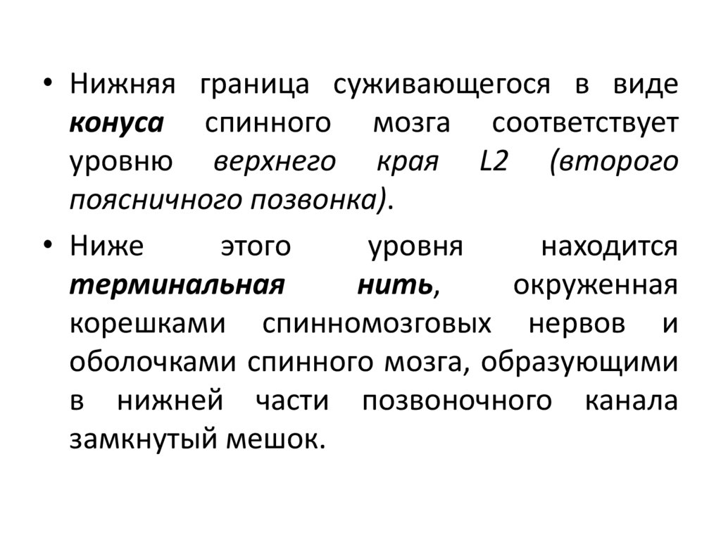 • Нижняя граница суживающегося в видеконуса спинного мозга соответствует