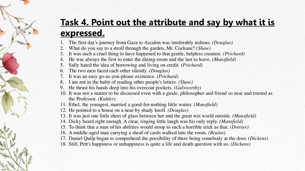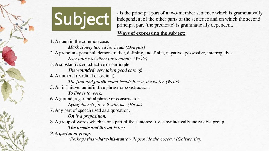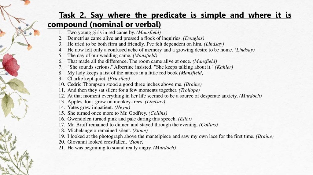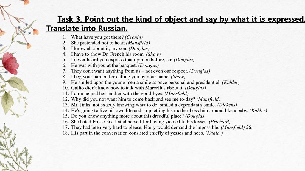 6. Task 1. Point out the subject and say by what it is expressed. Translate into Russian.