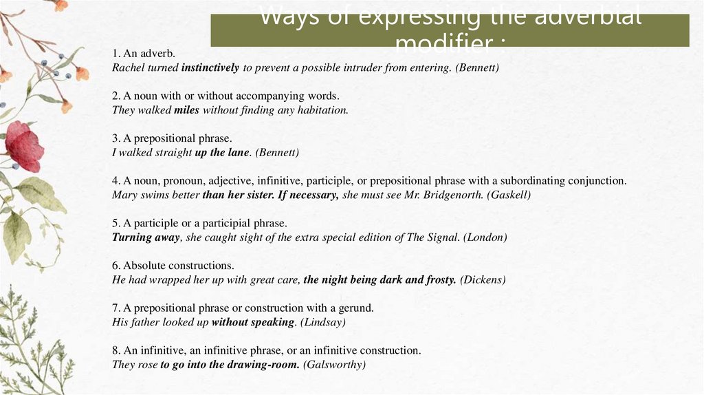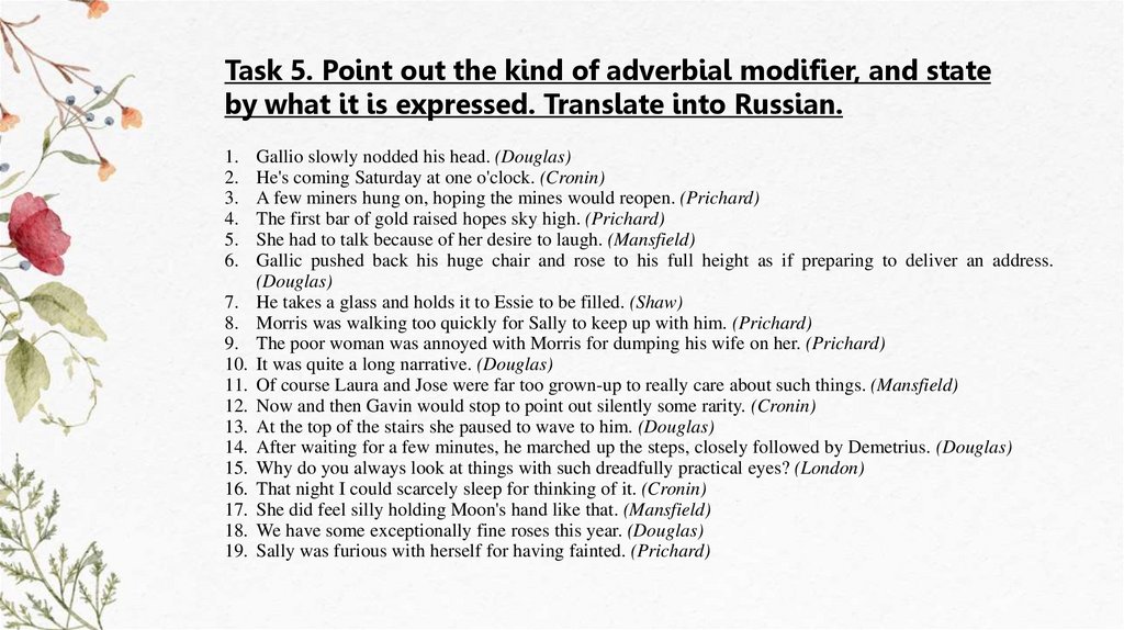 Task 5. Point out the kind of adverbial modifier, and stateby what it is expressed. Translate into Russian.