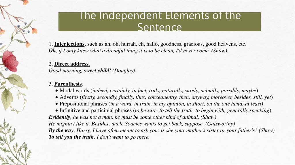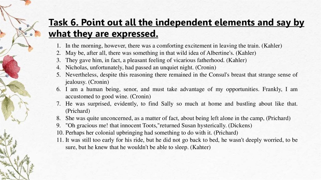 Task 6. Point out all the independent elements and say bywhat they are expressed.