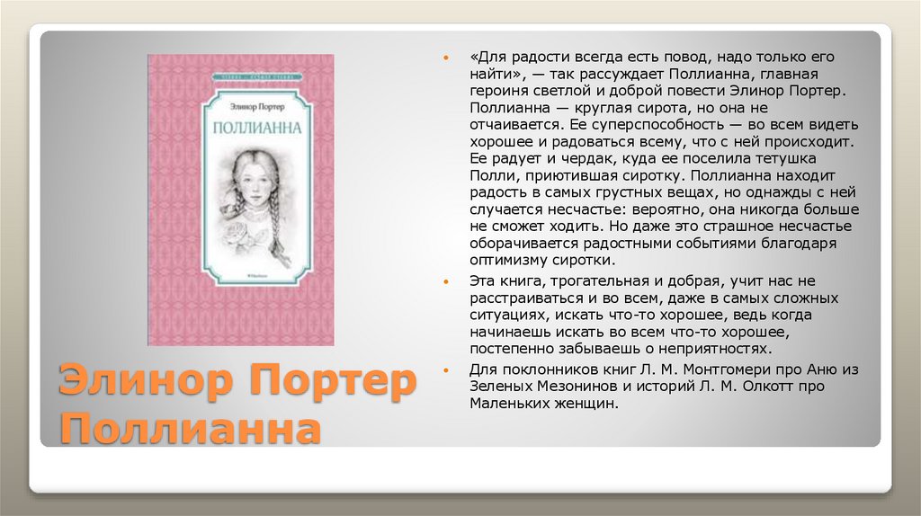 «Для радости всегда есть повод, надо только егонайти», — так рассуждает Поллианна, главная