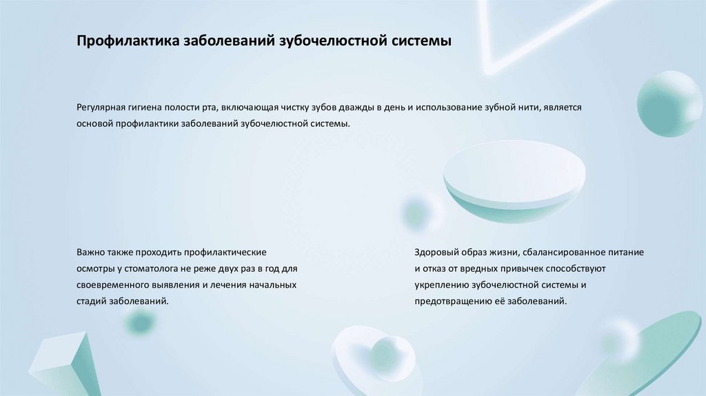 Профилактика заболеваний зубочелюстной системыРегулярная гигиена полости рта, включающая чистку зубов дважды в день и использование зубной нити, является