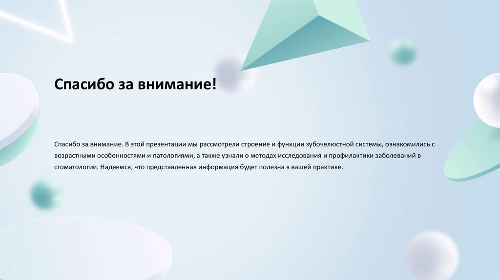 Спасибо за внимание!Спасибо за внимание. В этой презентации мы рассмотрели строение и функции зубочелюстной системы, ознакомились с
