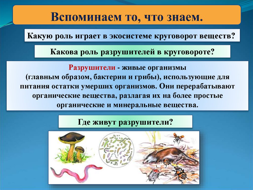 Какую роль играет в экосистеме круговорот веществ?Какова роль разрушителей в круговороте?
