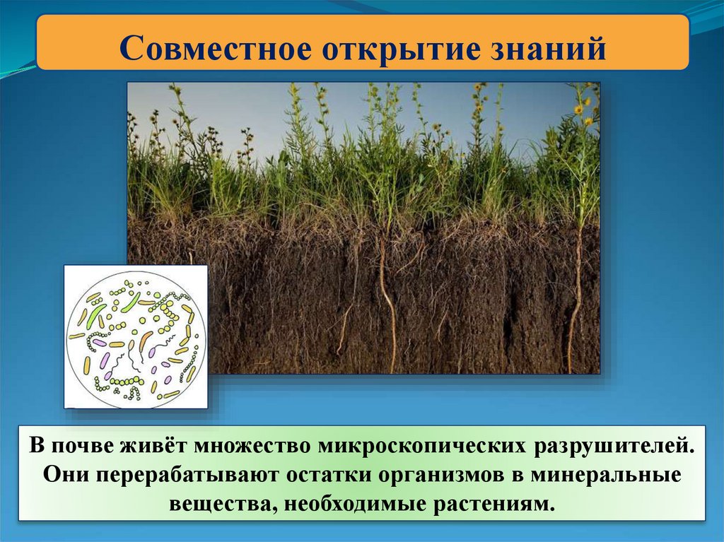 Совместное открытие знанийВ почве живёт множество микроскопических разрушителей.