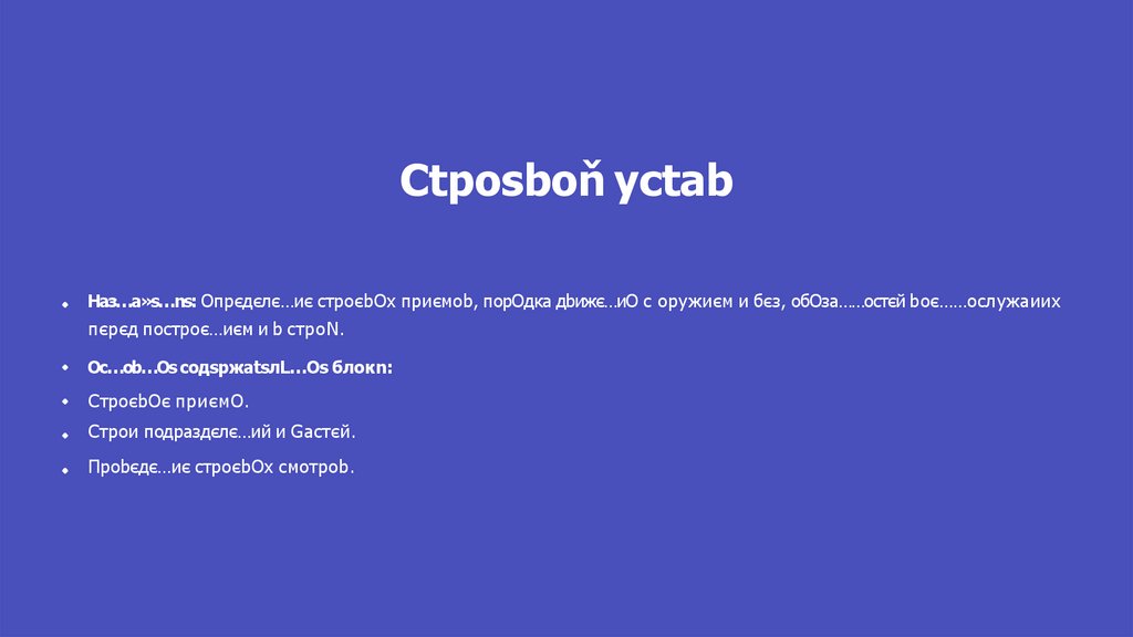 Cocтав: 7став в…утрє……єй службO, Дисnипли…ар…Oй устав, 7став гар…изо……ой и караулL…ой служб, Cтроєвой устав,