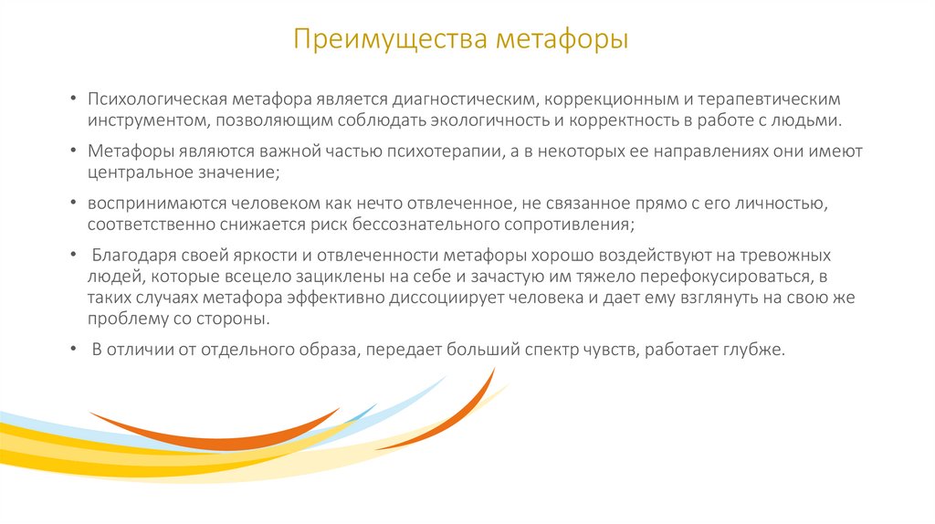 • Благодаря своей яркости и отвлеченности метафоры хорошо воздействуют на тревожных