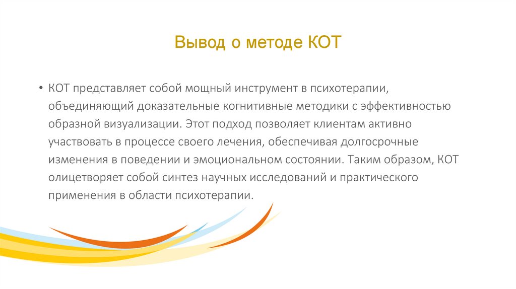 Вывод о методе КОТ• КОТ представляет собой мощный инструмент в психотерапии,
