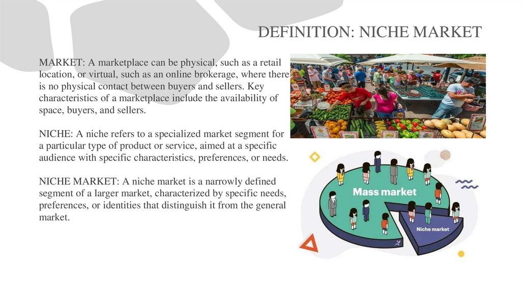 DEFINITION: NICHE MARKETMARKET: A marketplace can be physical, such as a retail