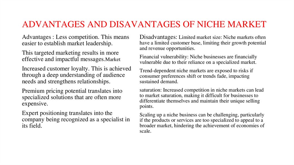 ADVANTAGES AND DISAVANTAGES OF NICHE MARKETAdvantages : Less competition. This means