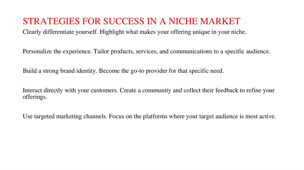 STRATEGIES FOR SUCCESS IN A NICHE MARKETClearly differentiate yourself. Highlight what makes your offering unique in your niche.