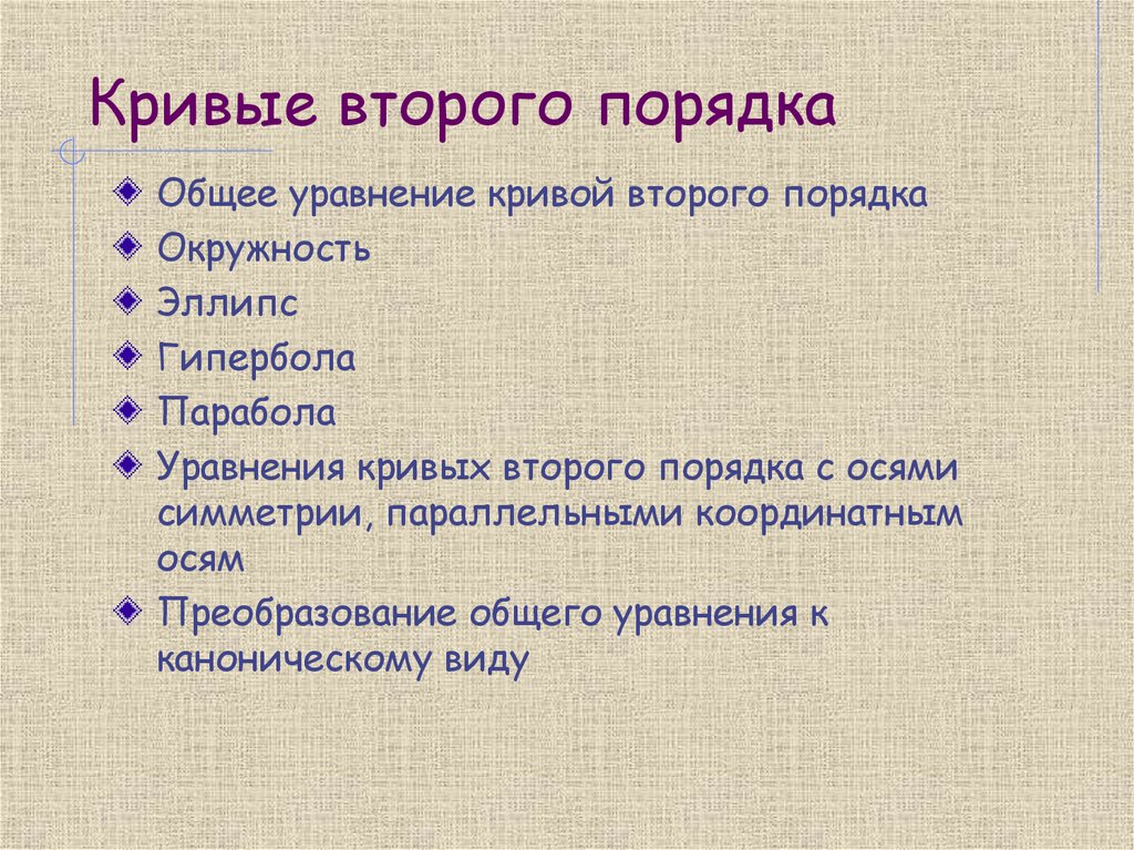 К кривым второго порядка относятся: эллипс, частным случаемкоторого является окружность, гипербола и парабола.