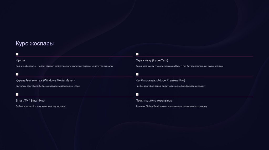 Бүгін біз бейне контент жасаудың толық циклін меңгердік – экран жазудан кәсіби монтажға және көрсетуге дейін. Енді сіздер өз оқу материалдарыңызды, презентацияларыңызды және шығармашылық