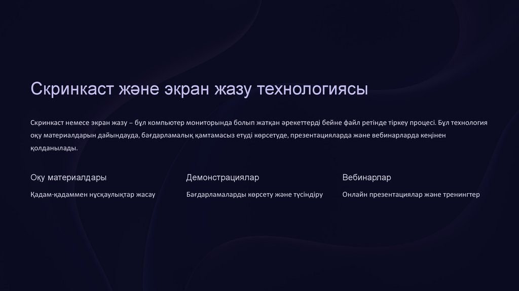 Скринкаст және экран жазу технологиясыСкринкаст немесе экран жазу – бұл компьютер мониторында болып жатқан әрекеттерді бейне файл ретінде тіркеу процесі. Бұл технология