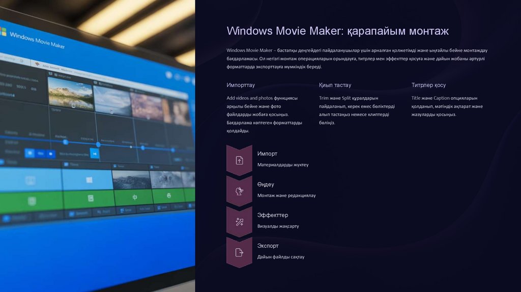 бағдарламасы. Ол негізгі монтаж операцияларын орындауға, титрлер мен эффекттер қосуға және дайын жобаны әртүрлі