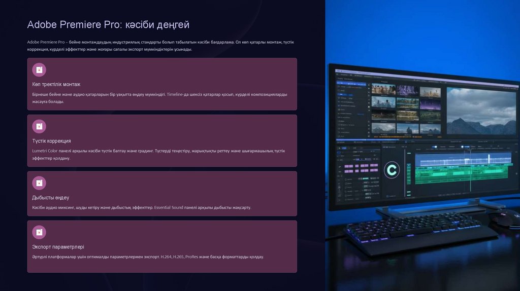 Adobe Premiere Pro: кәсіби деңгейAdobe Premiere Pro – бейне монтаждаудың индустриялық стандарты болып табылатын кәсіби бағдарлама. Ол көп қатарлы монтаж, түстік