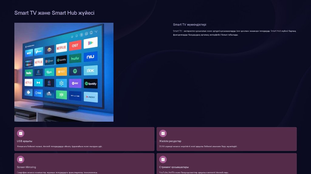 Smart TV – интернетке қосылатын және әртүрлі қосымшаларды іске қосатын заманауи теледидар. Smart Hub жүйесі барлық