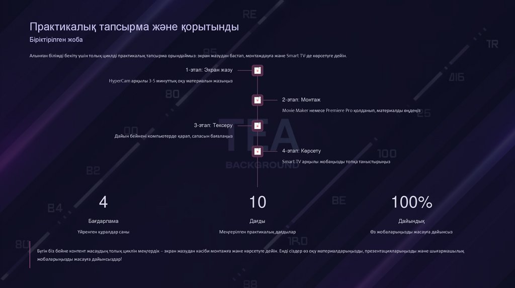 Алынған білімді бекіту үшін толық циклді практикалық тапсырма орындаймыз: экран жазудан бастап, монтаждауға және Smart TV-де көрсетуге дейін.