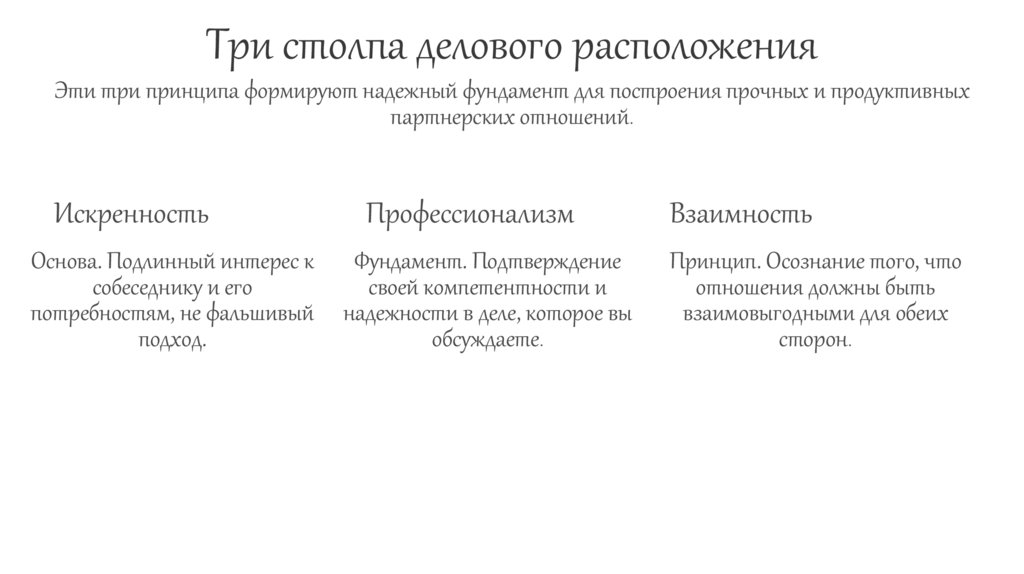 Три столпа делового расположенияЭти три принципа формируют надежный фундамент для построения прочных и продуктивных