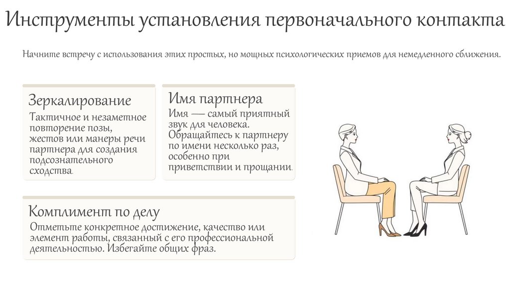 Инструменты установления первоначального контактаНачните встречу с использования этих простых, но мощных психологических приемов для немедленного сближения.