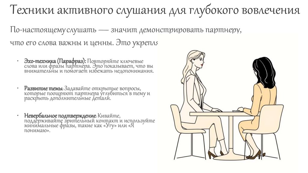 Техники активного слушания для глубокого вовлеченияПо-настоящемуслушать — значит демонстрировать партнеру,