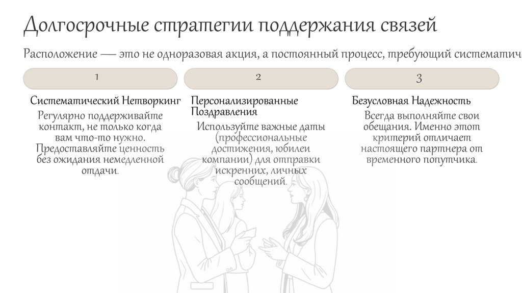 Долгосрочные стратегии поддержания связейРасположение — это не одноразовая акция, а постоянный процесс, требующий систематиче