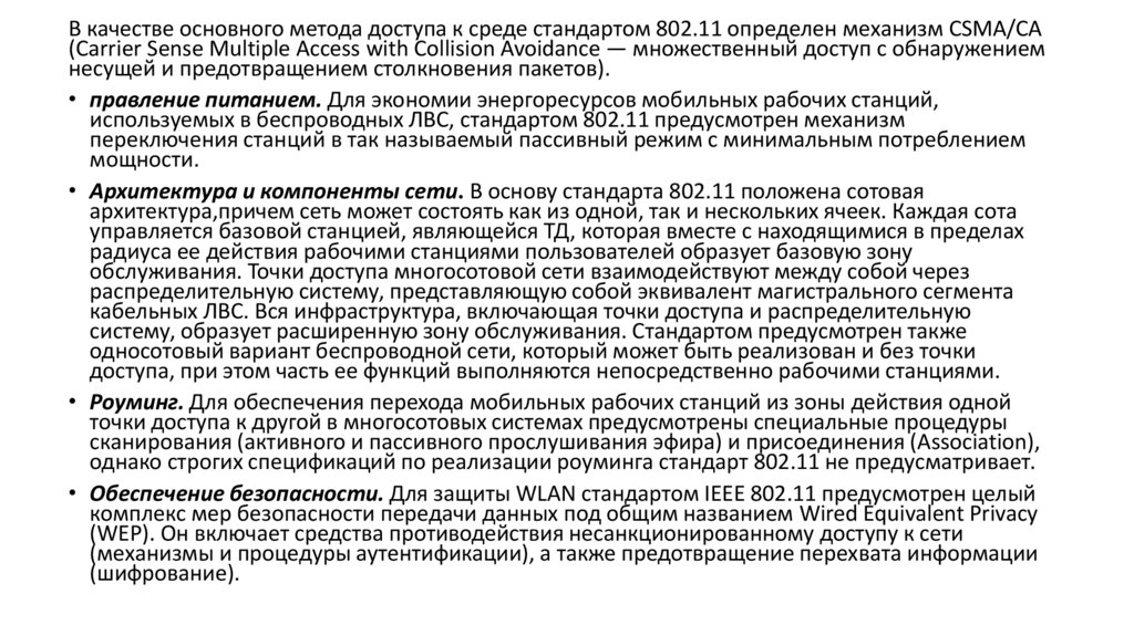 В качестве основного метода доступа к среде стандартом 802.11 определен механизм CSMA/CA(Carrier Sense Multiple Access with Collision Avoidance — множественный доступ с обнаружением