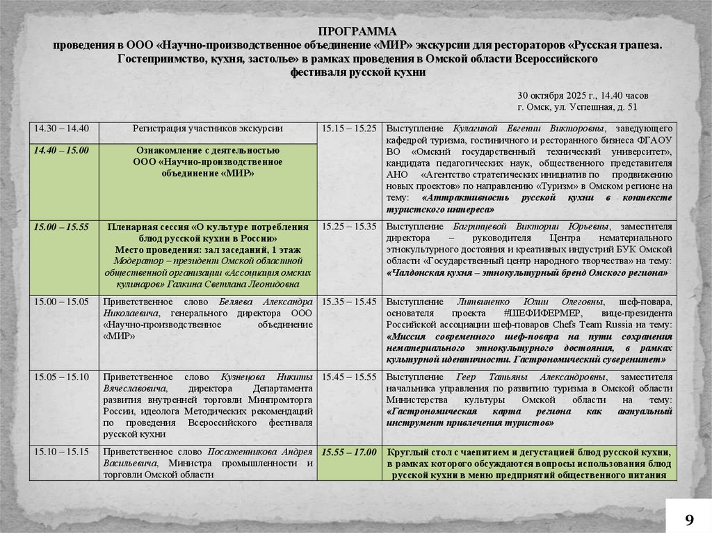 ПРОГРАММАпроведения в ООО «Научно-производственное объединение «МИР» экскурсии для рестораторов «Русская трапеза.
