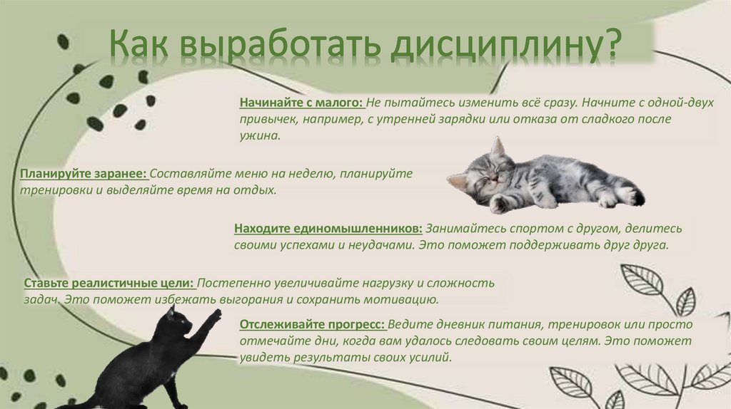 Начинайте с малого: Не пытайтесь изменить всё сразу. Начните с одной-двухпривычек, например, с утренней зарядки или отказа от сладкого после