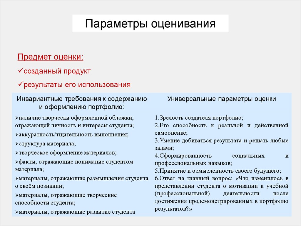 Параметры оцениванияПредмет оценки: