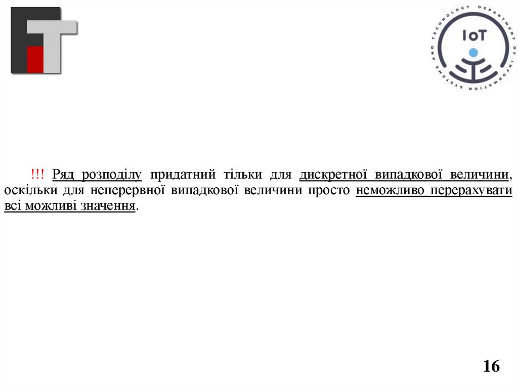 !!! Ряд розподілу придатний тільки для дискретної випадкової величини,оскільки для неперервної випадкової величини просто неможливо перерахувати