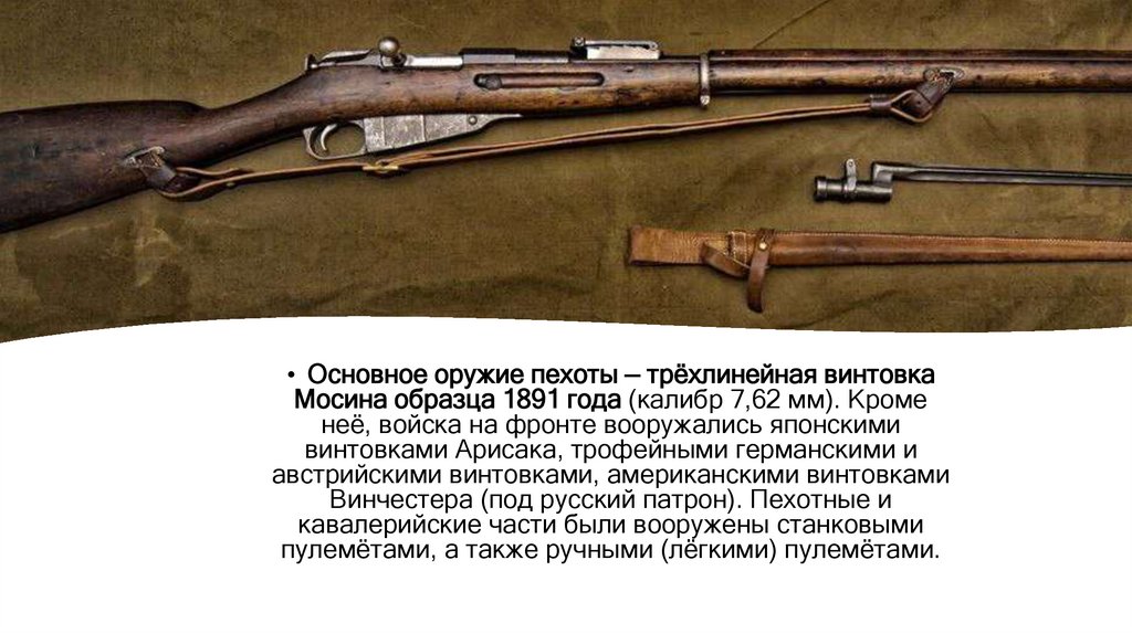 • Основное оружие пехоты — трёхлинейная винтовкаМосина образца 1891 года (калибр 7,62 мм). Кроме
