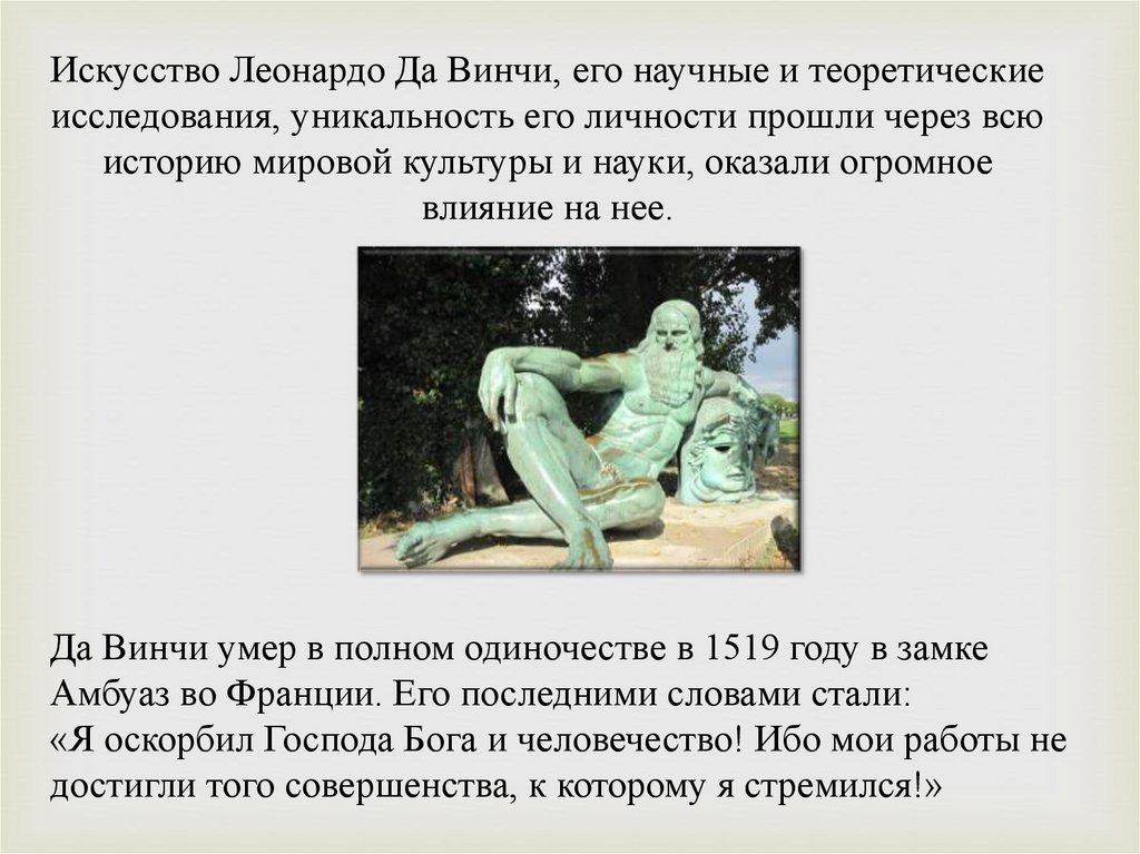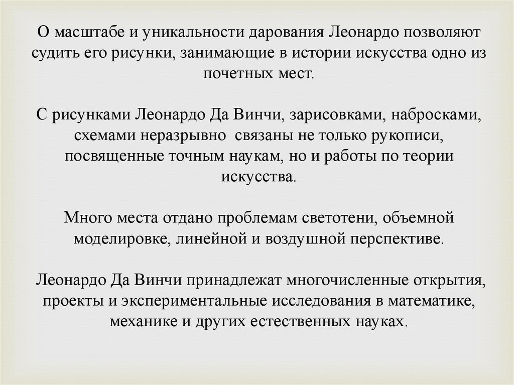 Искусство Леонардо Да Винчи, его научные и теоретическиеисследования, уникальность его личности прошли через всю