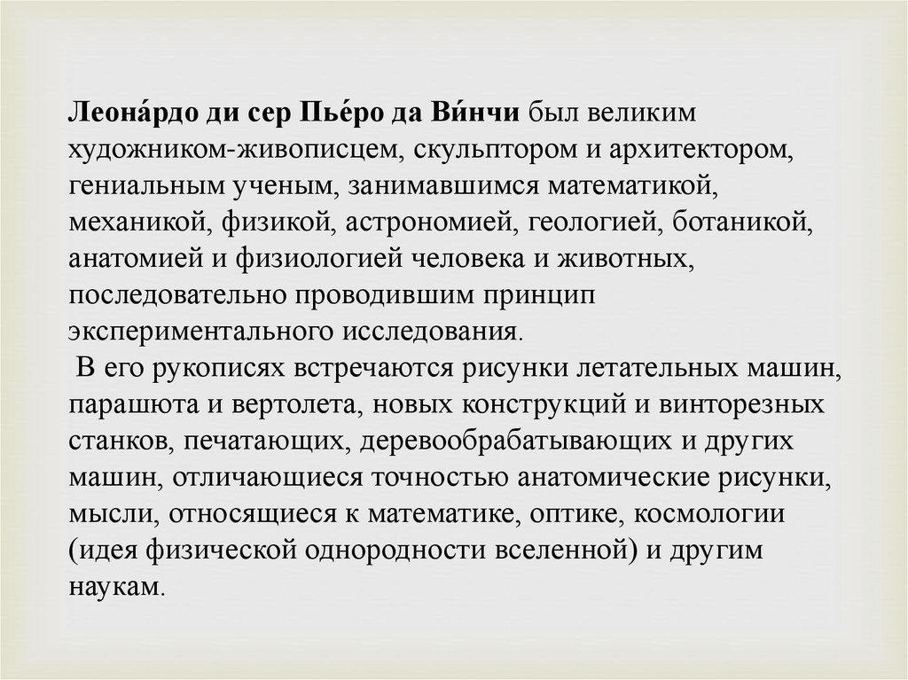 Леона́рдо ди сер Пье́ро да Ви́нчи был великимхудожником-живописцем, скульптором и архитектором,