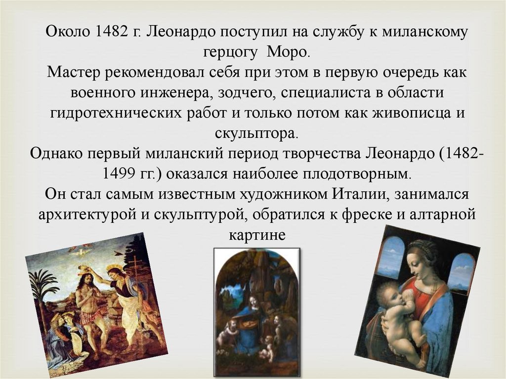 Около 1482 г. Леонардо поступил на службу к миланскомугерцогу Моро.
